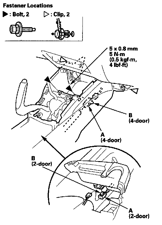 9. From the front portion of the center console, remove the bolts and clips, and disconnect the console subharness connector (A), then detach the connector clip (B).