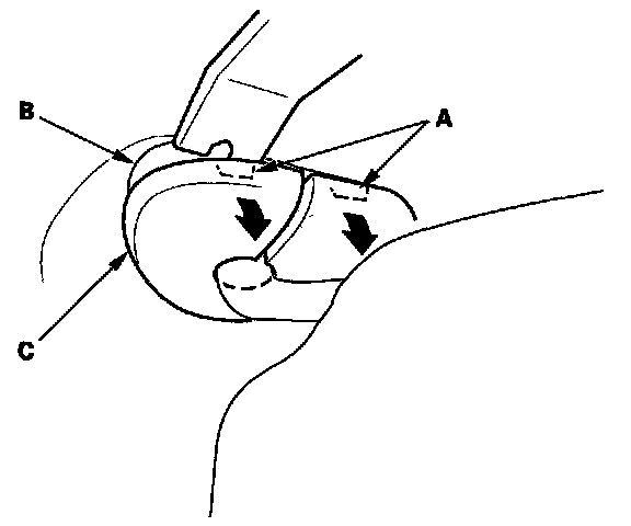 4. From both sides, release the tabs (A) from the bracket (B) using a trim tool of the sunvisor cap (C) from the bracket.