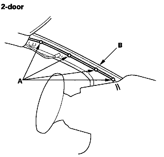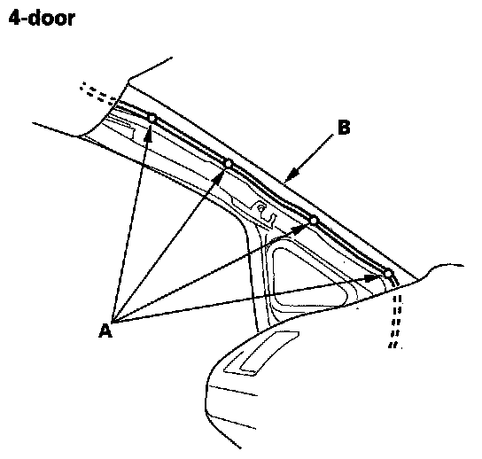 1. Remove the front door opening seals (B), and rear door opening seals (C) from each roof portion.