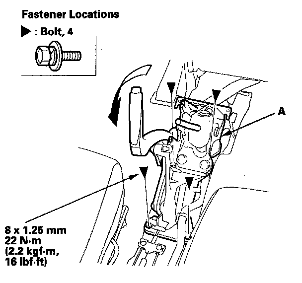 14. 4-door: Remove the bolts securing the parking brake base frame (A) and lay it down as needed.