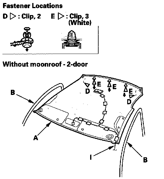 3. With the help of an assistant, detach the rear clips (E) by pulling the rear portion of the headliner down.