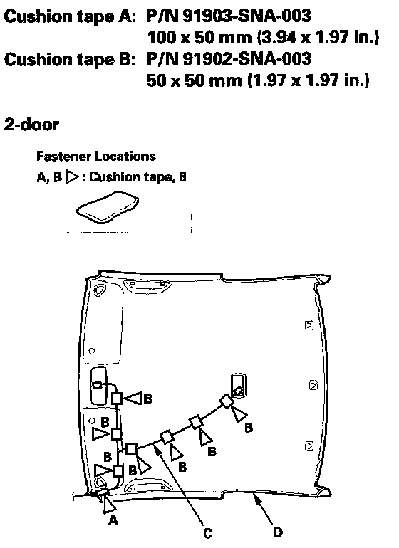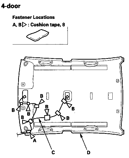17. If necessary, remove the cushion tape (A, B) fastening the roof wire harness (C) to the headliner (D), then remove them from the headliner.