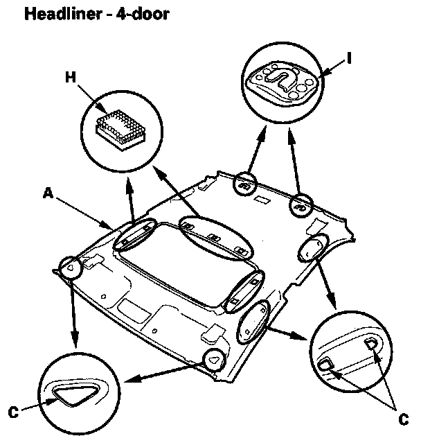 - Any Velcro fasteners (H) and clip bases (I) which have come off the headliner