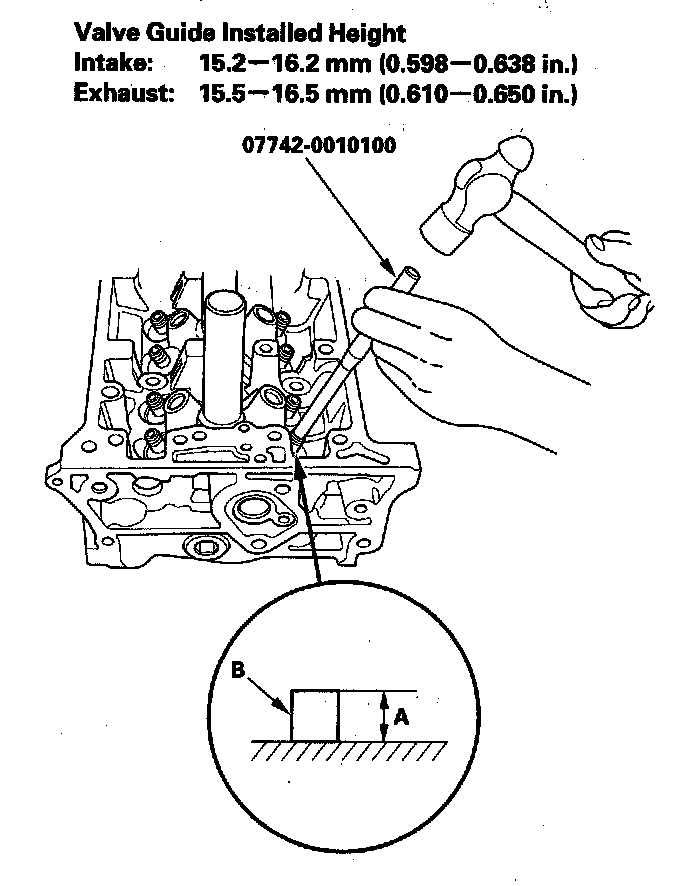 9. Apply a thin coat of new engine oil to the outside of the new valve guide. Install the guide from the camshaft side of the head, use the valve guide driver to drive the guide in to the specified installed height (A) of the guide (B). If you have all 16 guides to do, you may have to reheat the head.