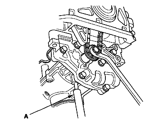 3. To hold the rear balancer shaft, insert a 6 mm pin driver (A) into the maintenance hole in the lower balancer shaft holder and through the rear balancer shaft.