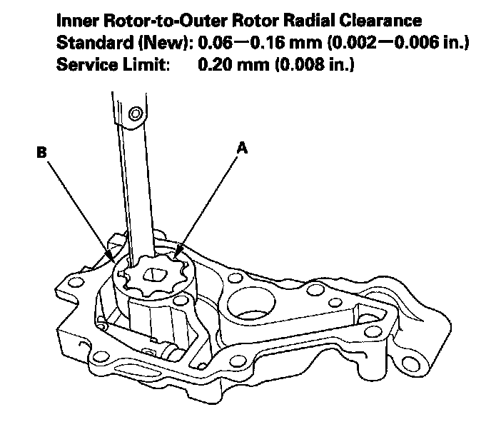 2. Check the inner-to-outer rotor radial clearance between the inner rotor (A) and outer rotor (B). If the inner-to-outer rotor radial clearance exceeds the service limit, replace the oil pump.