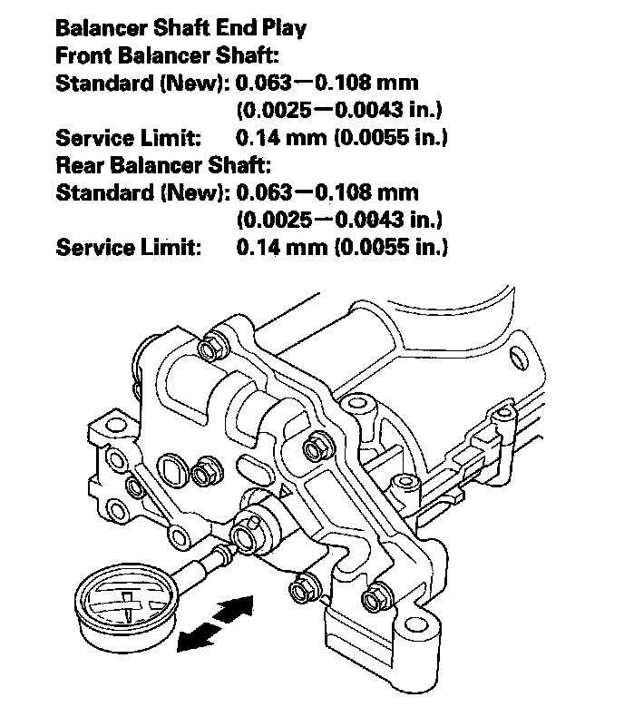 2. Zero the dial indicator against the end of the balancer shaft, then push the balancer shaft back and forth and read the end play.