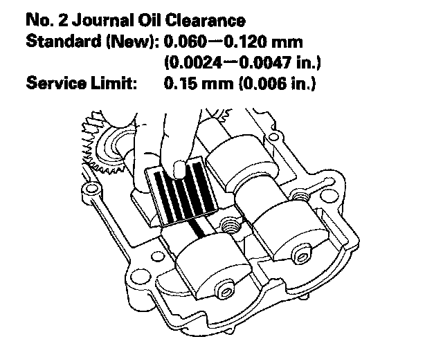 9. Remove the upper balancer shaft holder and bearings, and measure the widest part with the plastigage. If the balancer shaft No. 2 journal oil clearance is out-of-tolerance, install new bearings, and recheck. If it is still out-of-tolerance, replace the balancer shafts.
