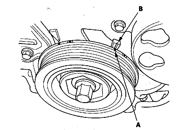 1. Turn the crankshaft pulley so its top dead center (TDC) mark (A) lines up with the pointer (B).