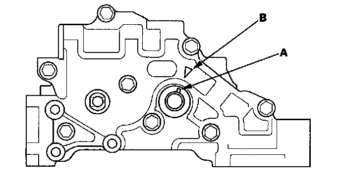 3. Check the housing-to-rotor axial clearance between the rotor (A) and pump housing (B). If the housing-to-rotor axial clearance exceeds the service limit, replace the oil pump.