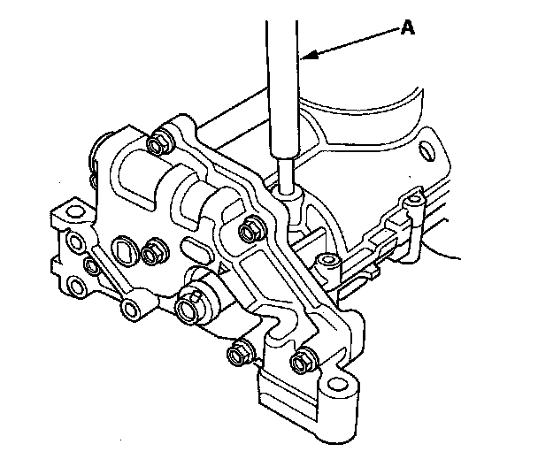 4. To hold the rear balancer shaft, insert a 6 mm pin driver (A) into the maintenance hole in the lower balancer shaft holder and through the rear balancer shaft.