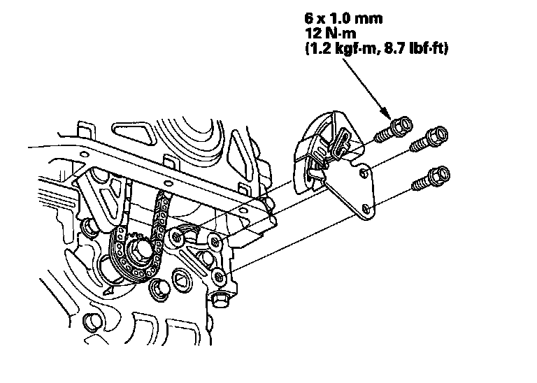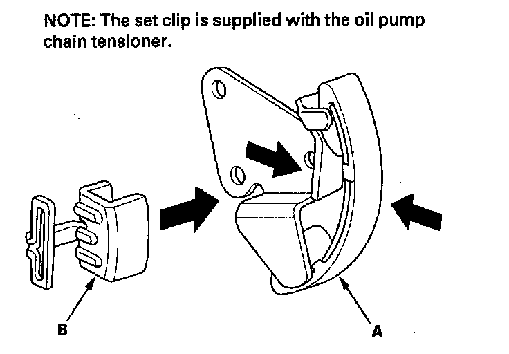 8. Squeeze the new oil pump chain tensioner (A), then install the set clip (B) on it as shown.