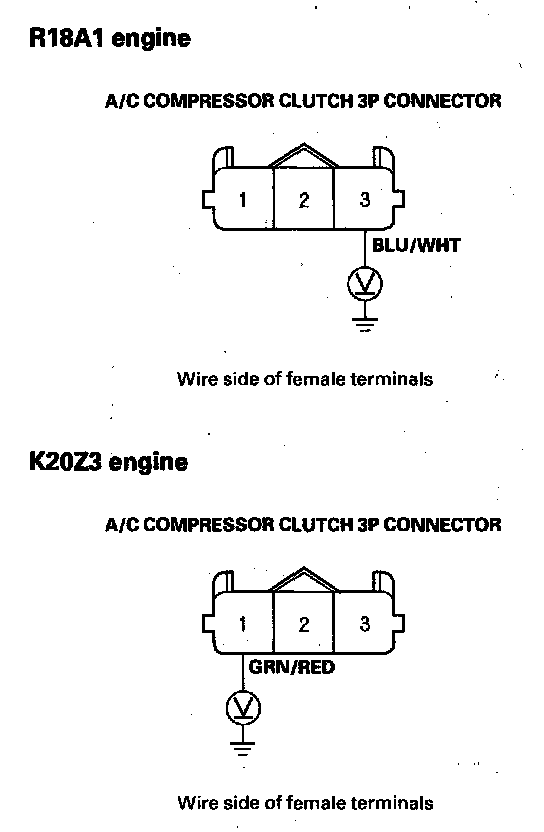 K20Z3 engine: Measure the voltage between the A/C compressor clutch 3P connector No. 1 terminal and body ground.