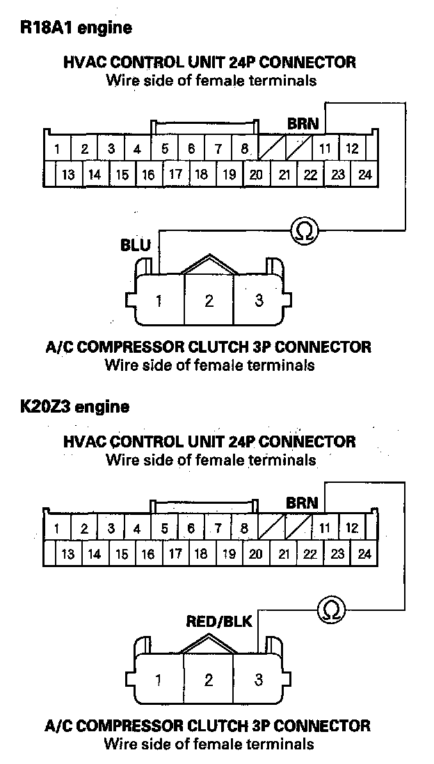 K20Z3 engine: Check for continuity between the HVAC control unit 24P connector No. 11 terminal and the A/C compressor clutch 3P connector No. 3 terminal.