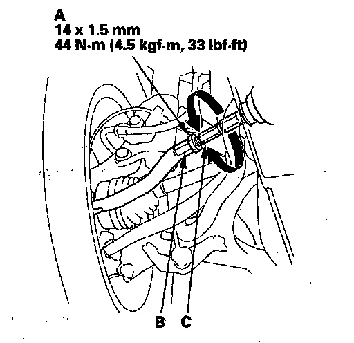 3. Hold the adjusting bolt (A) on the trailing arm (B), and remove the self-locking nut (C).