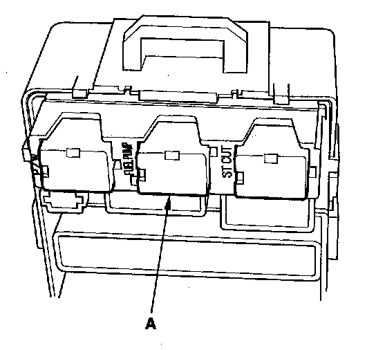 2. Remove the under-dash fuse/relay box, then remove PGM-FI main relay 2 (FUEL PUMP) (A) from the under-dash fuse/relay box.