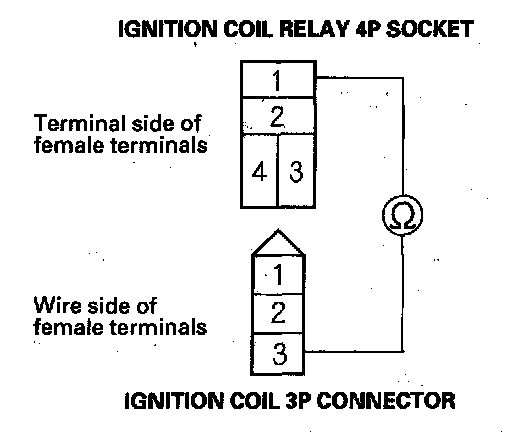 4. Check for continuity between each ignition coil relay 4P socket terminal No. 1 and the each ignition coil 3P connector terminal No. 3.