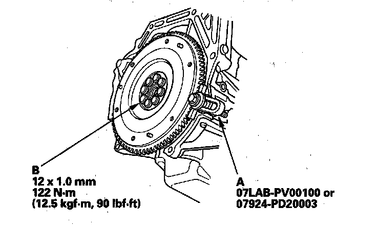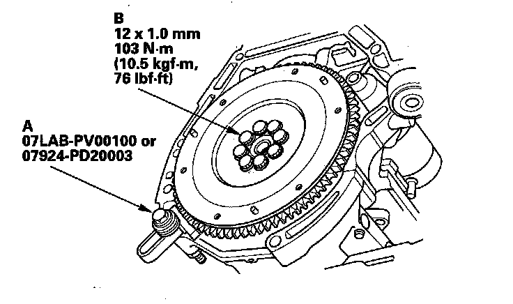 Tighten the flywheel mounting bolts (B) in a crisscross pattern in several steps.