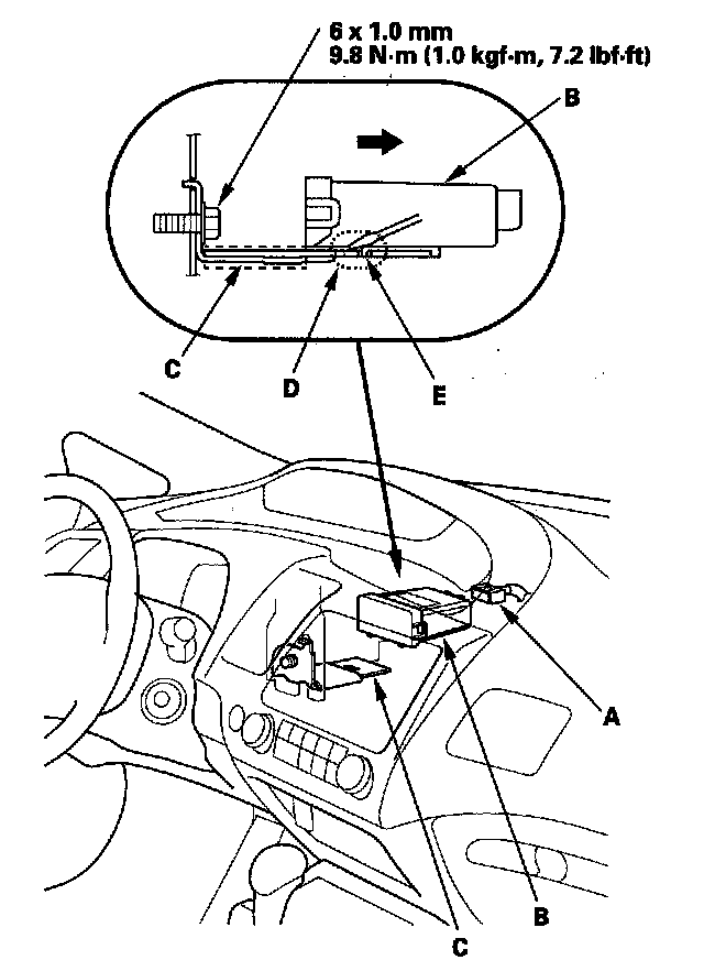 NOTE: While separating the TPMS control unit from the bracket, add in a flat-tipped screwdriver between the TPMS control unit and the bracket at shown aria (D) to release the hook (E), and slide out the TPMS control unit from the bracket.