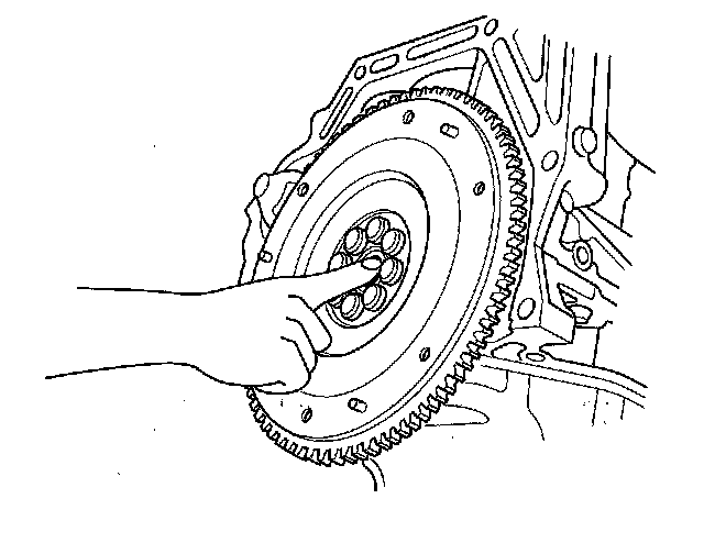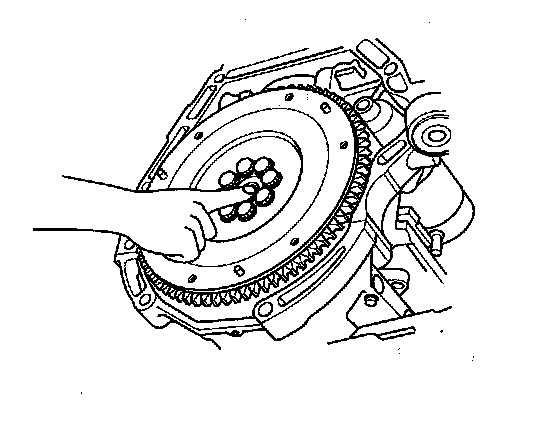 21. Remove the flywheel mounting bolts in a crisscross pattern in several steps, then remove the flywheel and ring gear holder.