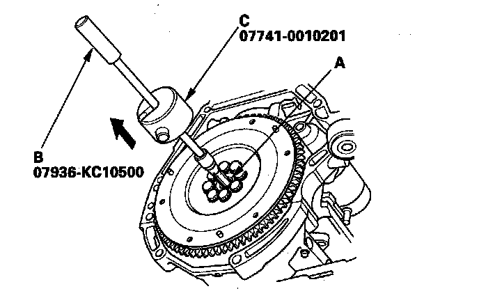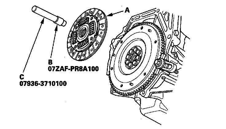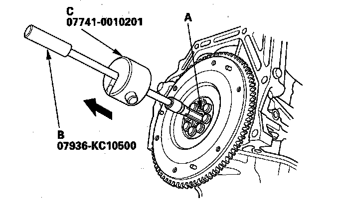8. Remove the clutch disc (A), clutch alignment shaft (B), and, remover handle (C).