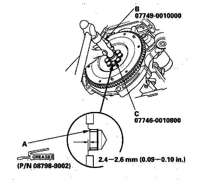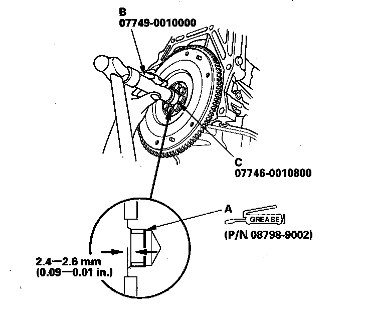 16. Install the new crankshaft pilot bushing (A) into the crankshaft using the driver (B) and 22 x 24 mm attachment (C). Apply a light coat of super high temp urea grease (P/N 08798-9002) to the crankshaft pilot bushing surface.
