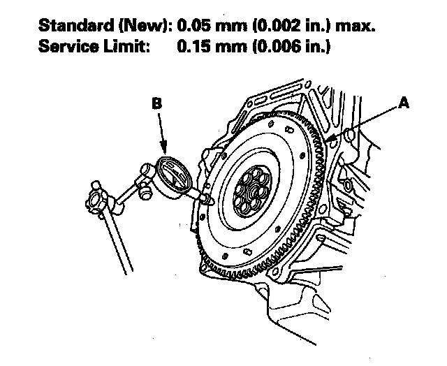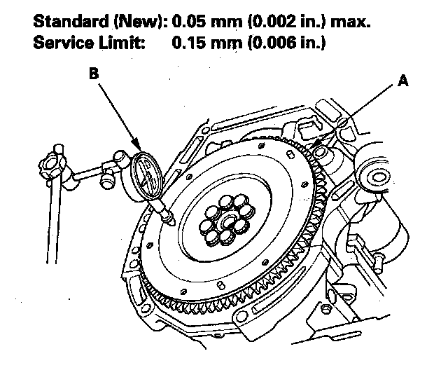 19. Measure the flywheel (A) runout using a dial indicator (B) through at least two full turns with pushing against the flywheel each time you turn it to take up the crankshaft thrust washer clearance. If the runout is more than the service limit, replace the flywheel, go to step 20, and recheck the runout.