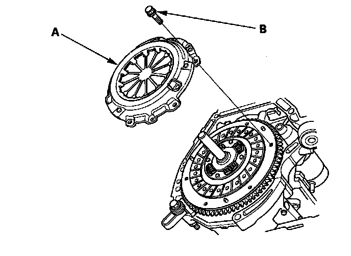 27. Install the pressure plate (A) and the mounting bolts (B) finger-tight.