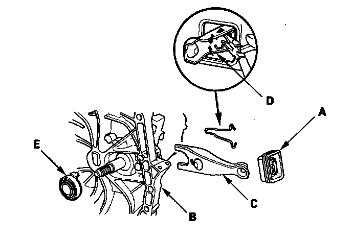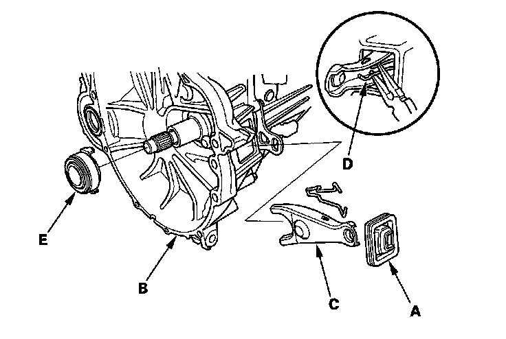 32. Remove the release fork (C) from the clutch housing by squeezing the release fork set spring (D) with pliers. Remove the release bearing (E).