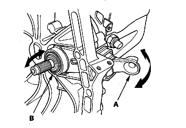 38. Move the release fork (A) right and left to make sure that it fits properly against the release bearing (B) and that the release bearing slides smoothly.