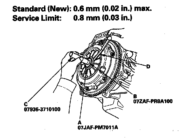 2. Check the height of the diaphragm spring fingers using the clutch alignment disc (A), clutch alignment shaft (B), remover handle (C), and a feeler gauge (D). If the height is more than the service limit, replace the pressure plate.