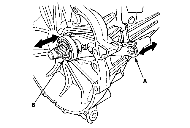 38. Move the release fork (A) right and left to make sure that it fits properly against the release bearing (B), and that the release bearing slides smoothly.