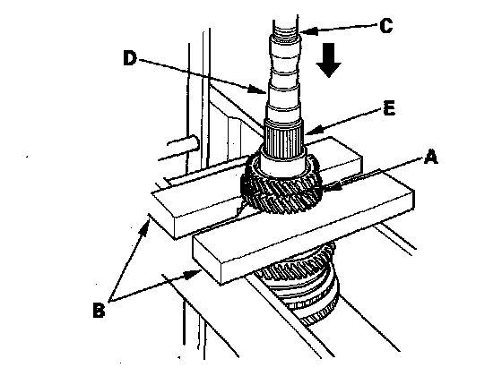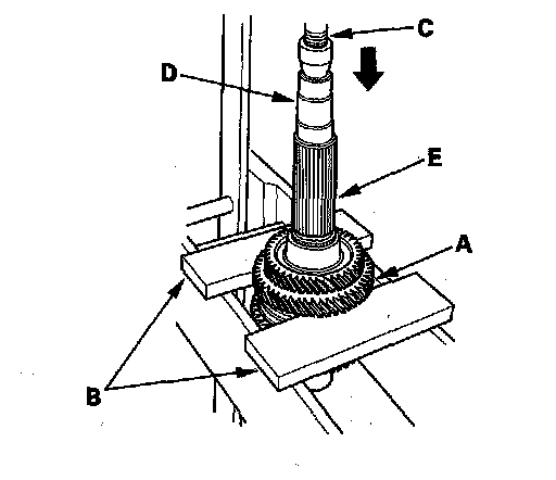 5. Support 4th gear (A) on steel blocks (B), then use a press (C) and an attachment (D) to press the countershaft (E) out of the 5th gear.