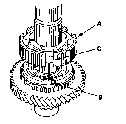 11. Install 2nd gear (A) by aligning the synchro cone fingers (B) with the grooves (C) in 2nd gear.