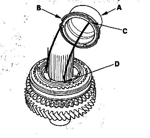 4. Install the triple cone synchro assembly (A) by aligning the synchro ring fingers (B) with the grooves in 1st gear (C), then install the synchro spring (D).
