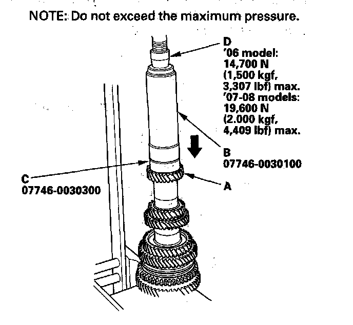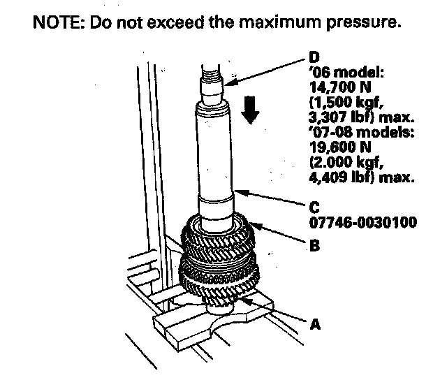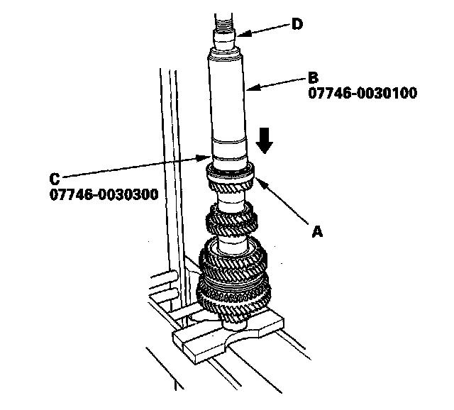 15. Install 6th gear (A) using the 40 mm I.D. driver (B), 30 mm I.D. attachment (C), and a press (D).