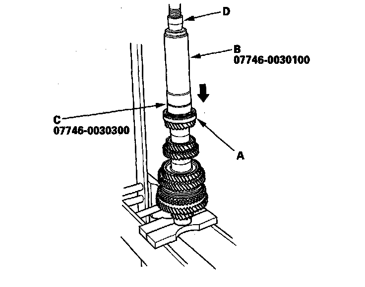 21. Install 6th gear (A) using the 40 mm I.D. driver (B), 30 mm I.D. attachment (C), and a press (D).