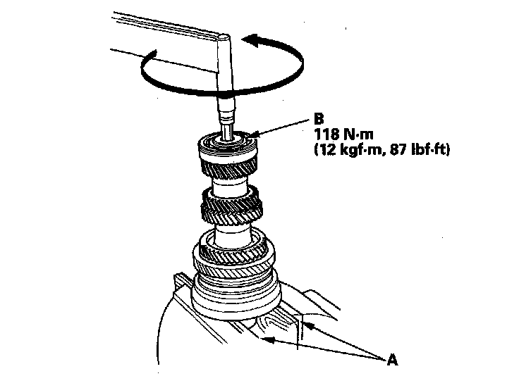 23. Securely clamp the countershaft assembly in a bench vise with wood blocks (A).