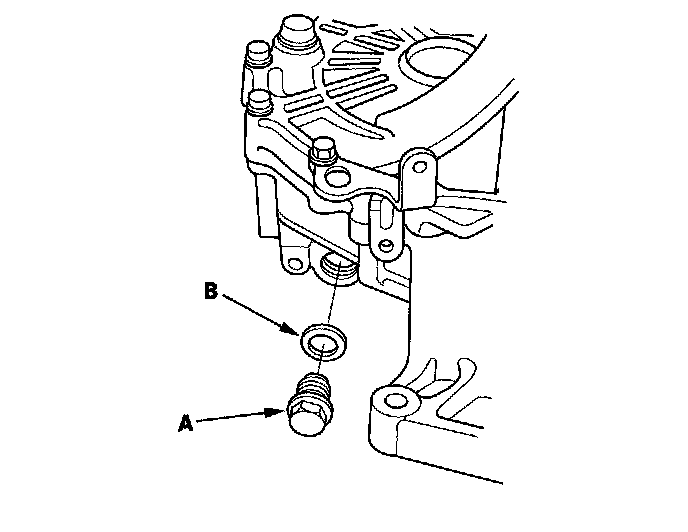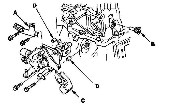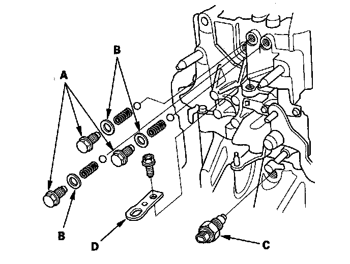 1. Remove the detent bolts (A), 12 mm washers (B) springs, steel balls, and the back-up light switch (C). Then remove the transmission hanger (D).