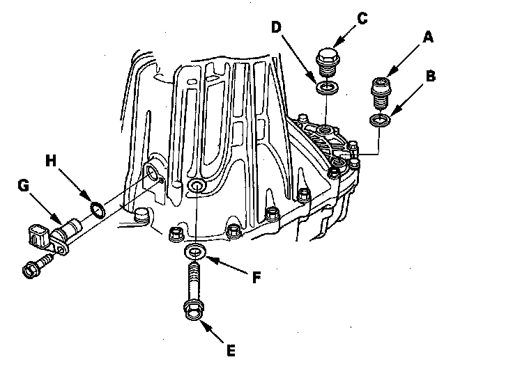 4. Remove the drain plug (A), the 14 mm sealing washer (B), the filler plug (C), 20 mm sealing washer (D), the 10 mm flange bolt (E), 10 mm washer (F), the output shaft (countershaft) speed sensor (G), and the O-ring (H).
