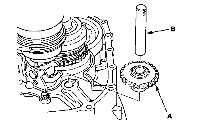 10. Remove the reverse idler gear (A) and the reverse gear shaft (B).