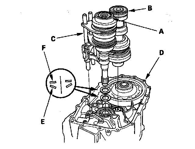 12. Apply tape to the mainshaft splines to protect the seal, then remove the mainshaft assembly (A) and countershaft assembly (B) with the shift forks (C) from the clutch housing (D).
