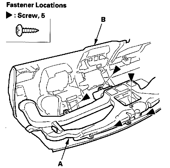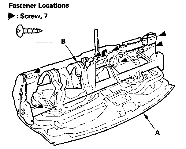 6. From the back of the dashboard, remove the screws, then separate the dashboard (A) from the steering hanger beam (B).