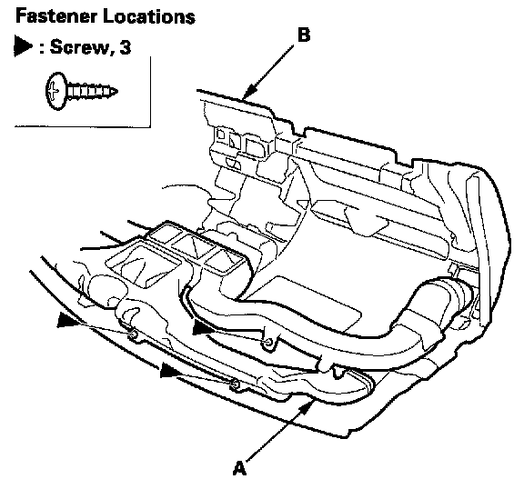 7. Remove the screws securing the dashboard duct (A) on the dashboard (B).