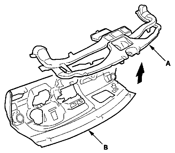 8. Remove the dashboard duct (A) from the dashboard(B).