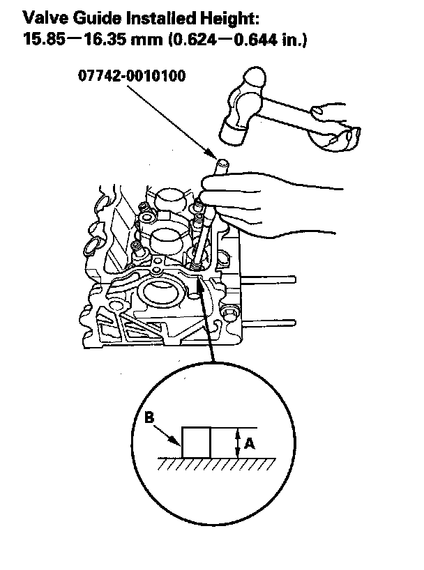 9. Apply a thin coat of new engine oil to the outside of the new valve guide. Install the guide from the camshaft side of the head; use the valve guide driver to drive the guide in to the specified installed height (A) of the guide (B). If you have all 16 guides to do, you may have to reheat the head.