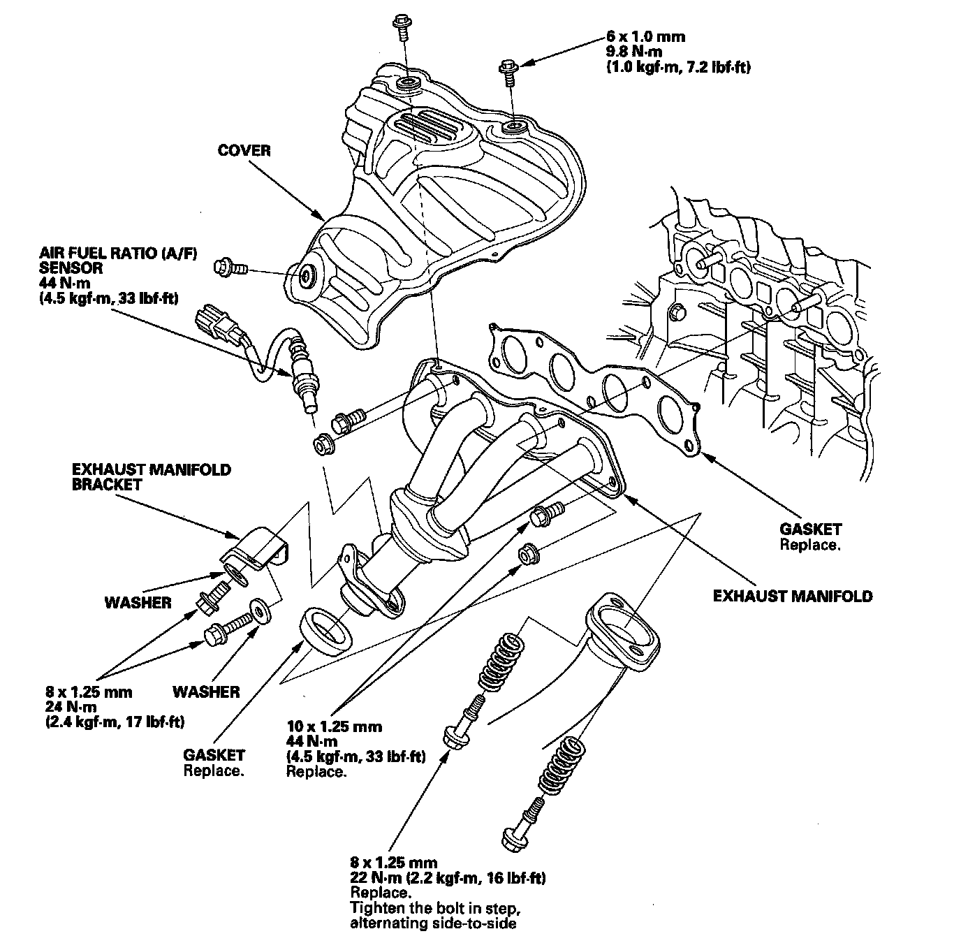 2. Install the exhaust manifold and tighten the bolts/nuts in a crisscross pattern in three steps, beginning with the inner bolt.