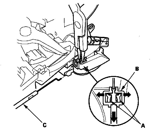 3. Expand the cable stops (A) in the cable holder (B) using snap ring pliers, then pull out the control cable (C).