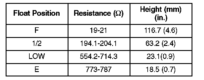 The fuel gauge is controlled by the CPU in the gauge assembly. The fuel gauge sending unit (part of the fuel tank unit) sends a fuel level signal to the CPU in the gauge assembly through the YEL/BLK wire (cavity A 18). The signal varies depending on the position of the float in the fuel tank which changes the resistance of the sending unit. When the CPU determines that the fuel level is low, it turns on the low fuel indicator. The sending unit's resistance varies as shown.