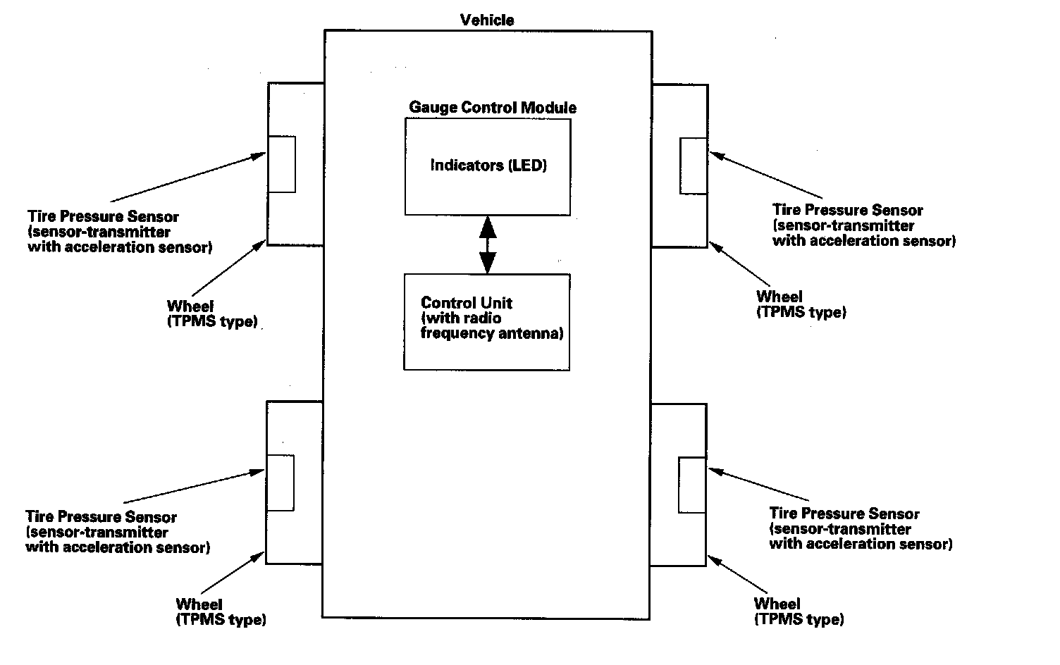 ^ When the vehicle is traveling more than 28 mph (45 km/h), an RF (radio frequency) band wave signal is continuously transmitted from each tire pressure sensor to the control unit.